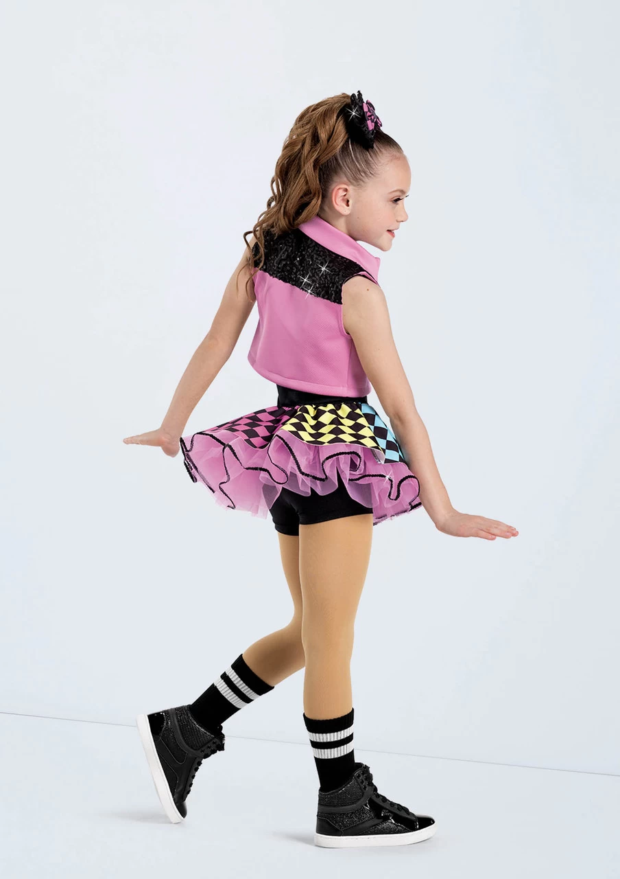 -Top skirt is multicolor checkered print neoprene over sequin trimmed tricot