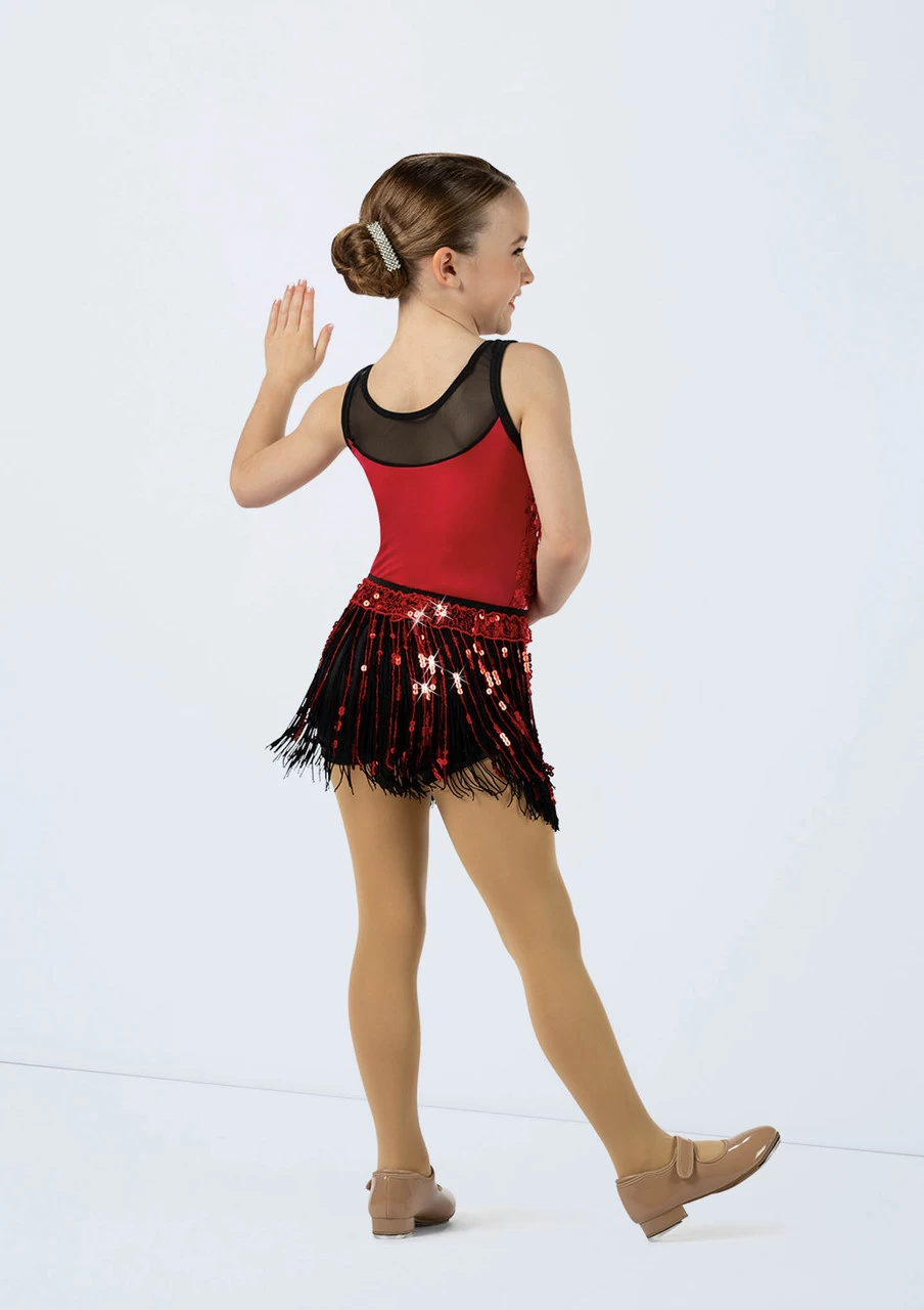 -Three piece, includes biketard, bustle skirt and fringe skirt
