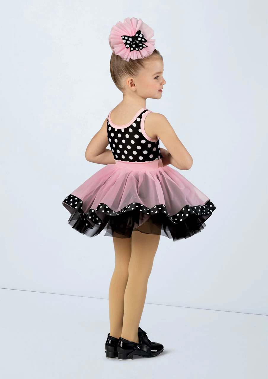 -Polka dot sequined bow at the shiny spandex waist inset