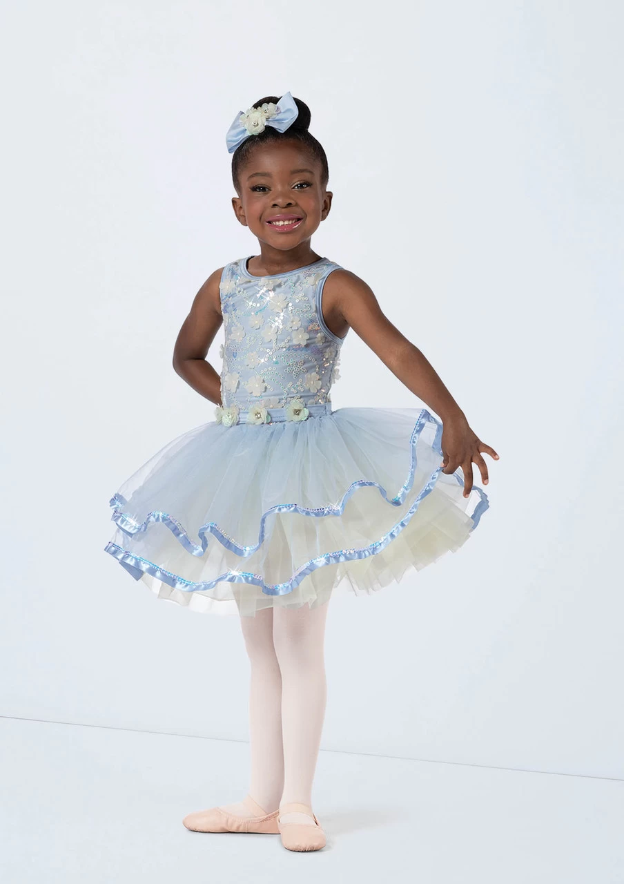 -Tiered tutu is tricot with iridescent sequin and satin ribbon trim